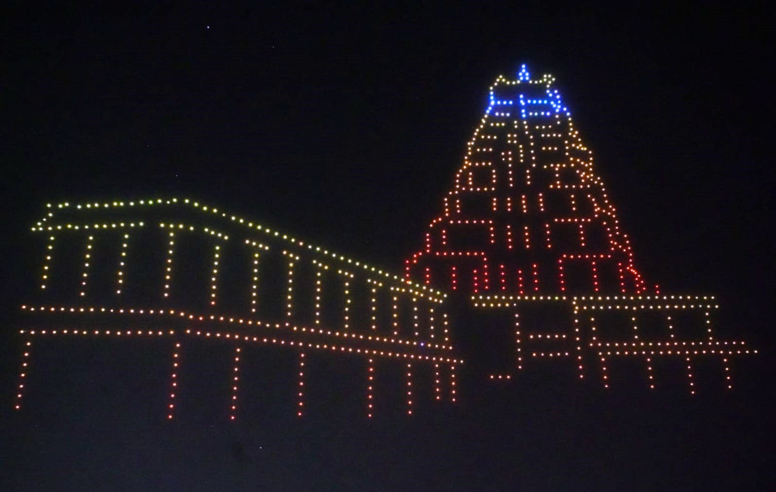 ನೂರಾರು ಡ್ರೋನ್ಗಳು ಆಕಾಶದಲ್ಲಿ ಹಂಪಿಯ ಪ್ರಸಿದ್ಧ ಕಲ್ಲಿನ ರಥ, ಭವ್ಯವಾದ ವಿರೂಪಾಕ್ಷ ದೇವಾಲಯ ಮತ್ತು ಬಡವಿ ಲಿಂಗ ಹಾಗೂ ಉಗ್ರ ನರಸಿಂಹನ ಮೂರ್ತಿಗಳನ್ನು ಕಲಾತ್ಮಕವಾಗಿ ಬಿಂಬಿಸಿದವು. ವಿಜಯನಗರ ಸಾಮ್ರಾಜ್ಯವನ್ನು ಜಗತ್ತಿಗೆ ಪರಿಚಯಿಸಿದ ಅಪ್ರತಿಮ ವೀರ, ಕನ್ನಡಿಗರ ಹೆಮ್ಮೆಯ ಸಾಮ್ರಾಟ ಶ್ರೀಕೃಷ್ಣದೇವರಾಯರ ಭಾವಚಿತ್ರವು ಆಕಾಶದಲ್ಲಿ ಮೂಡಿಬಂದಾಗ ಜನರಿಂದ ಹರ್ಷೋದ್ಗಾರ ವ್ಯಕ್ತವಾಯಿತು. ಇದರೊಂದಿಗೆ ಪ್ರವಾಸಿಗರ ಆಕರ್ಷಣೀಯ ಕೇಂದ್ರವಾಗಿರುವ ಹಂಪಿಯ ದರೋಜಿ ಕರಡಿಧಾಮ ಚಿತ್ರಣಗಳು ಪ್ರದರ್ಶನದ ಮೆರುಗನ್ನು ಹೆಚ್ಚಿಸಿದವು.