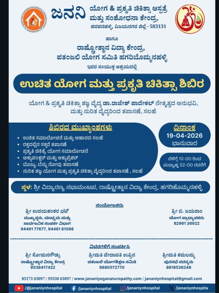 ರಾಷ್ಟ್ರೋತ್ಥಾನ ವಿದ್ಯಾಕೇಂದ್ರ, ಪತಂಜಲಿ ಯೋಗ ಸಮಿತಿ ಮತ್ತು ಹರಪನಹಳ್ಳಿಯ ಜನನಿ ಯೋಗ ಹಾಗೂ ಪ್ರಕೃತಿ ಚಿಕಿತ್ಸಾ ಆಸ್ಪತ್ರೆ ಮತ್ತು ಸಂಶೋಧನಾ ಕೇಂದ್ರದ ಸಹಯೋಗದಲ್ಲಿ ಏ.19 ರಂದು ಬೆ.10 ಗಂಟೆಗೆ ವಿದ್ಯಾಕೇಂದ್ರದ ಆವರಣದಲ್ಲಿ ಉಚಿತವಾಗಿ ಯೋಗ ಮತ್ತು ಪ್ರಕೃತಿ ಚಿಕಿತ್ಸಾ ಶಿಬಿರ ಹಮ್ಮಿಕೊಳ್ಳಲಾಗಿದೆ.